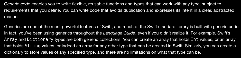 swap을 하기 위한 메서드는 하나지만 DataType을 받는 파라미터 하나로, Int, String, Double 타입을 파라미터로 받아서 swap이 가능해졌습니다. 위에서 적었던 애플 문서 내용 중 아래의 내용들.. 명확하게 이해가 되지 않으시나요?!