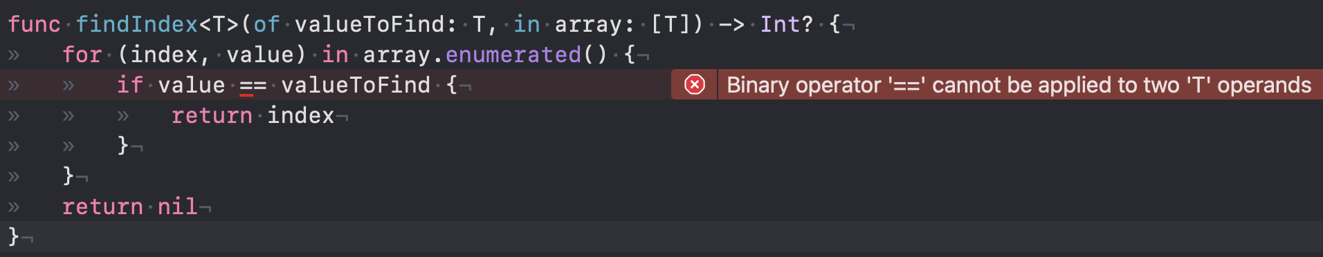 이 예시만 보고는 사실 'generic한 타입이 특정 타입이어야한다'와 무슨 관계가 있나 싶을 수도 있는데 Swift에서는 기본 타입들(Int, Double, String 등)이 Equatable이라는 프로토콜을 채택하고 있기 때문에 해당 메서드에서는 컴파일 에러가 없었지만 generic 타입이 특정 타입이거나 특정 프로토콜을 채택했음을 설정하는 Constraint(: Type)을 다음과 같이 없애면