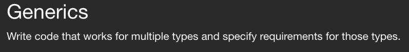 Generic의 정의를 보면 multiple types에 대해 동작하는 code를 작성하고, 그 types에 대한 특정한 요구사항을 지정한다.